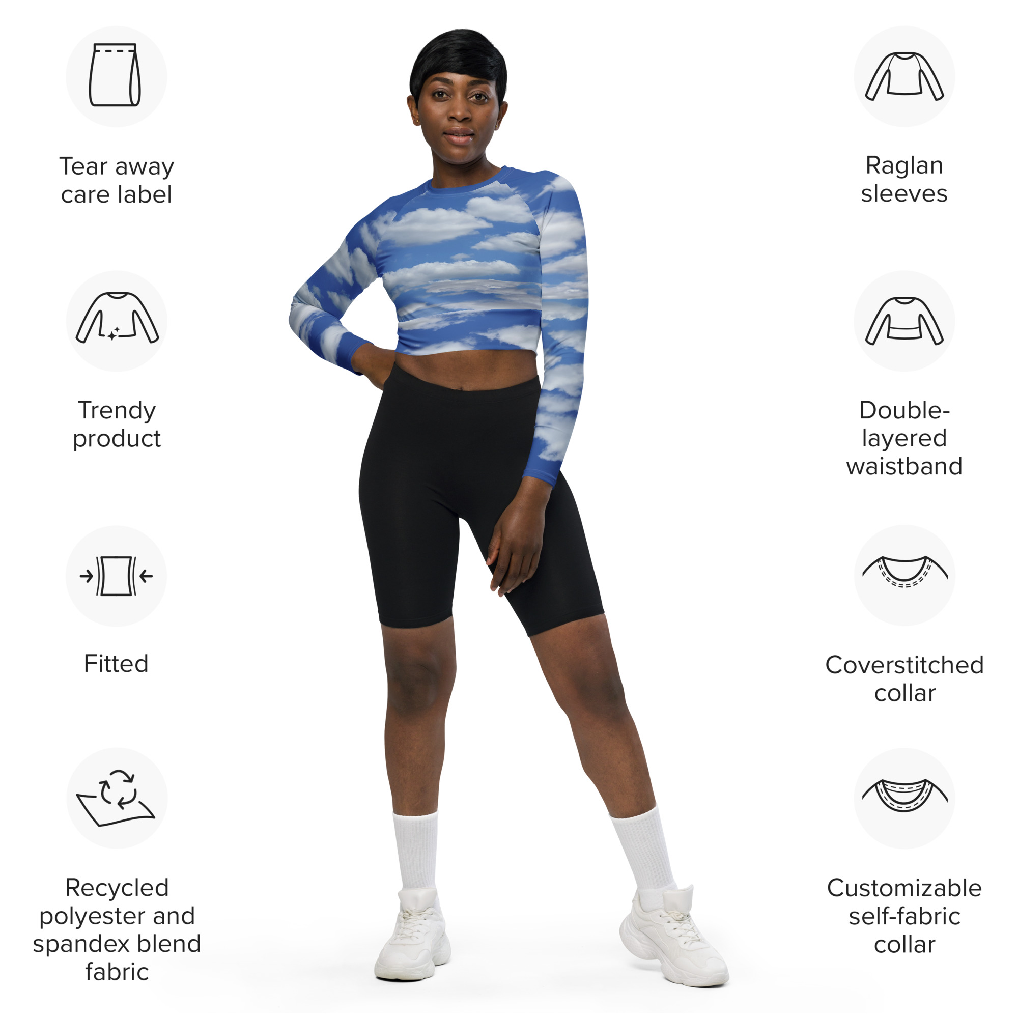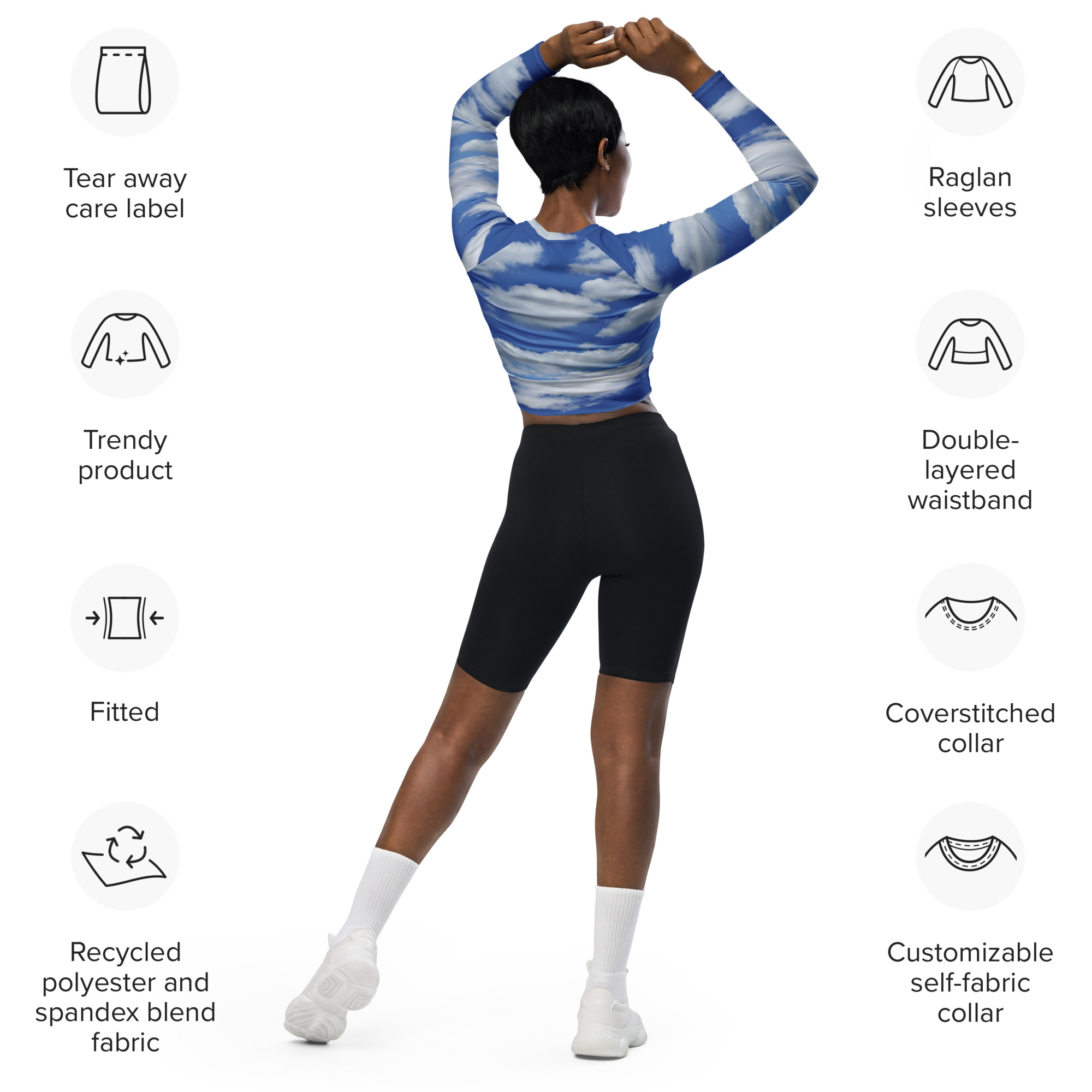 Designed using photos of the sky above the WetRock flower farm (WRG on Facebook). This long-sleeve crop top is made of recycled polyester and elastane, making it an eco-friendly choice for swimming, sports, or athleisure outfits. The crop top has a wide, double-layered waistline band for a comfortable fit. Other crop tops we carry: https://wetrock.com/WRGwp/?s=crop&post_type=product