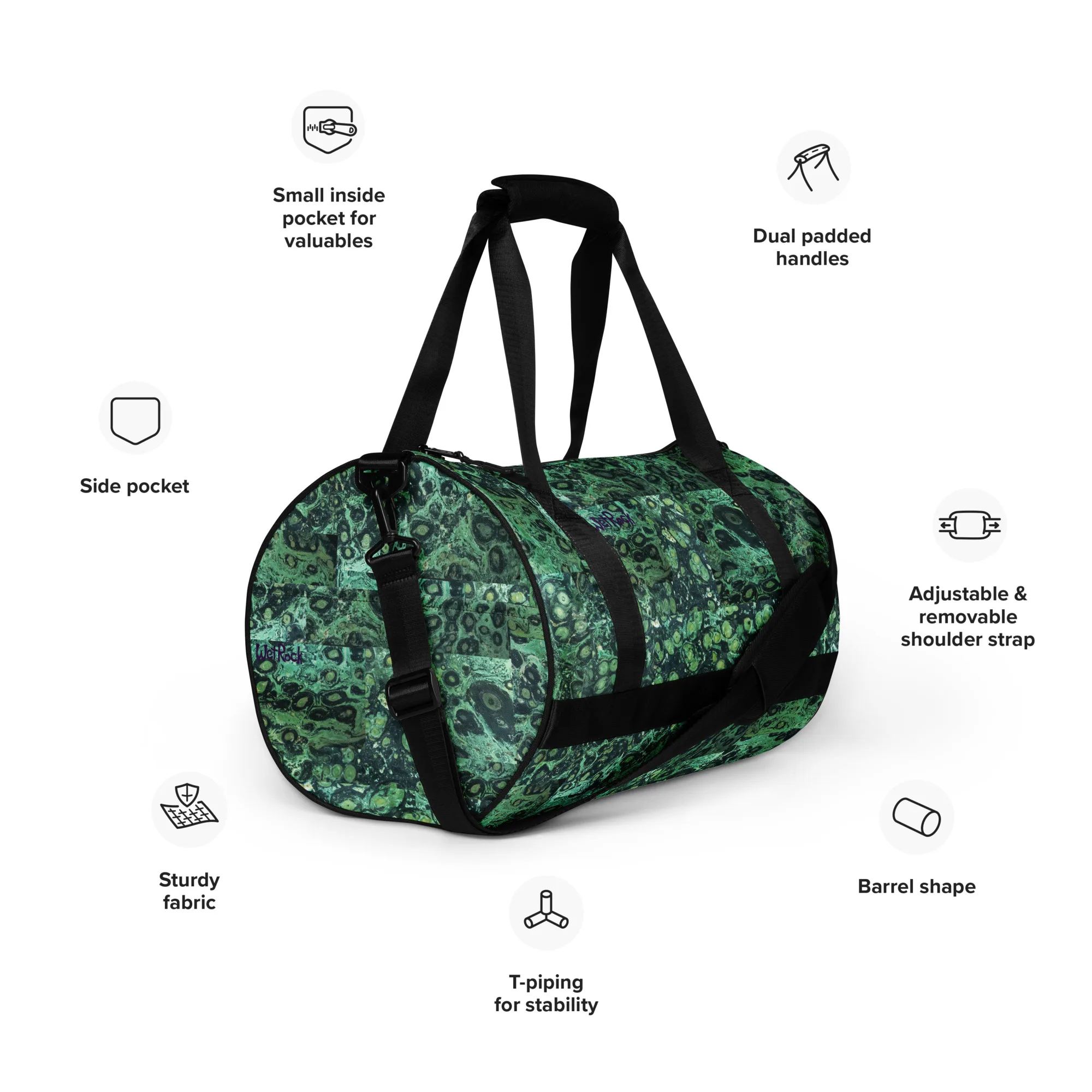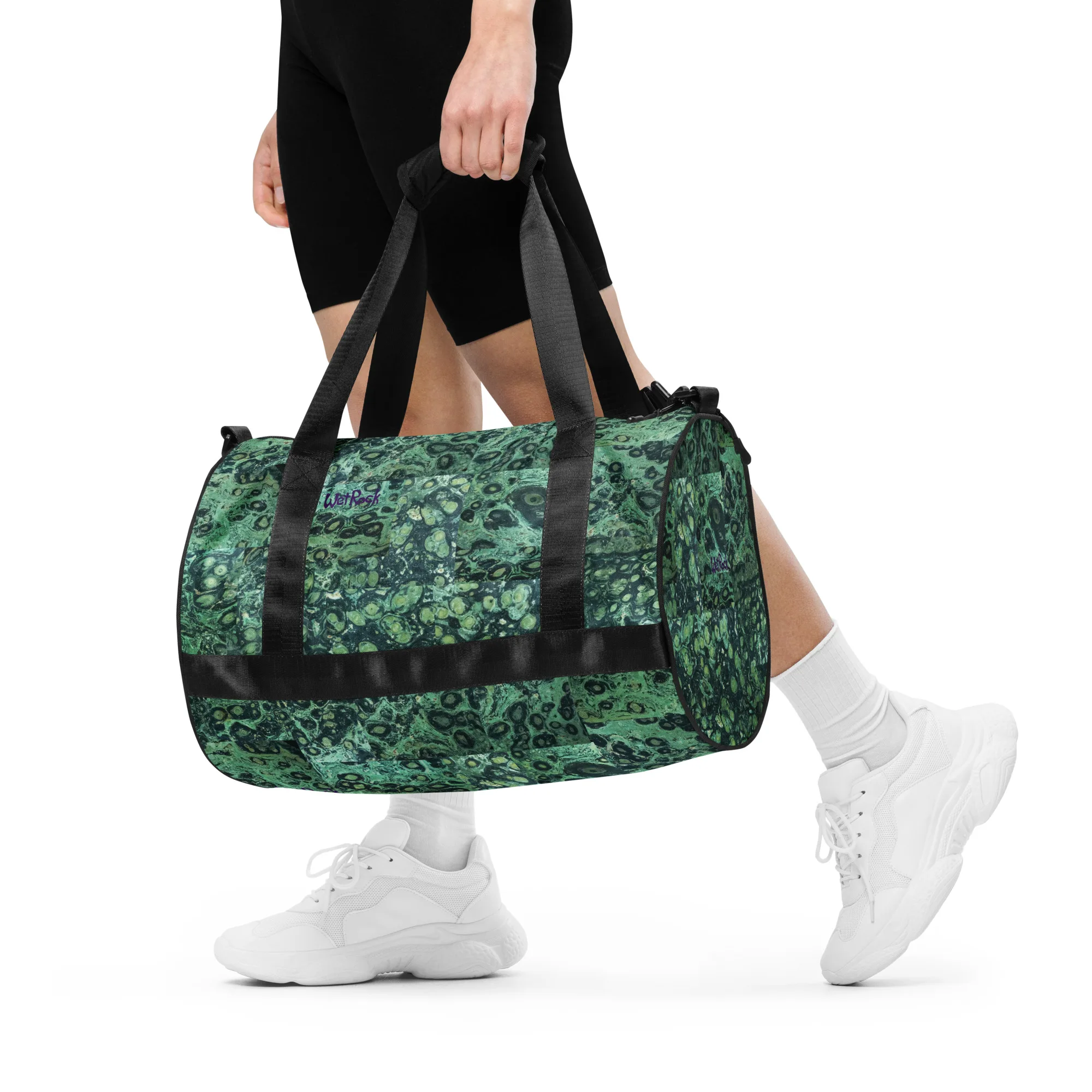 Ready to get your fitness on? Add some punch to pumping iron with this all-over print gym bag. Made from 100% polyester and sturdy, water-resistant fabric, this bag is fun meets function. And it’s got pockets!