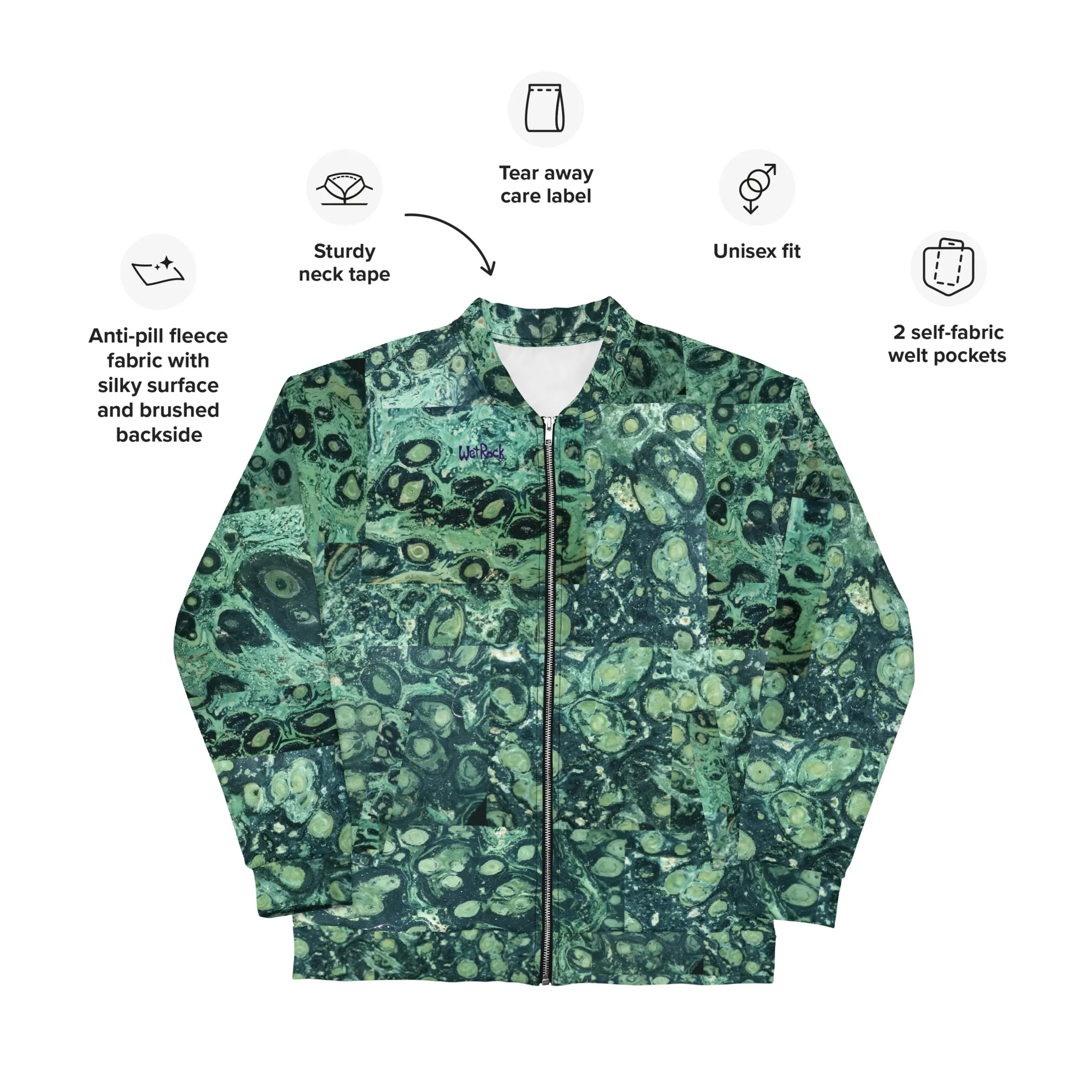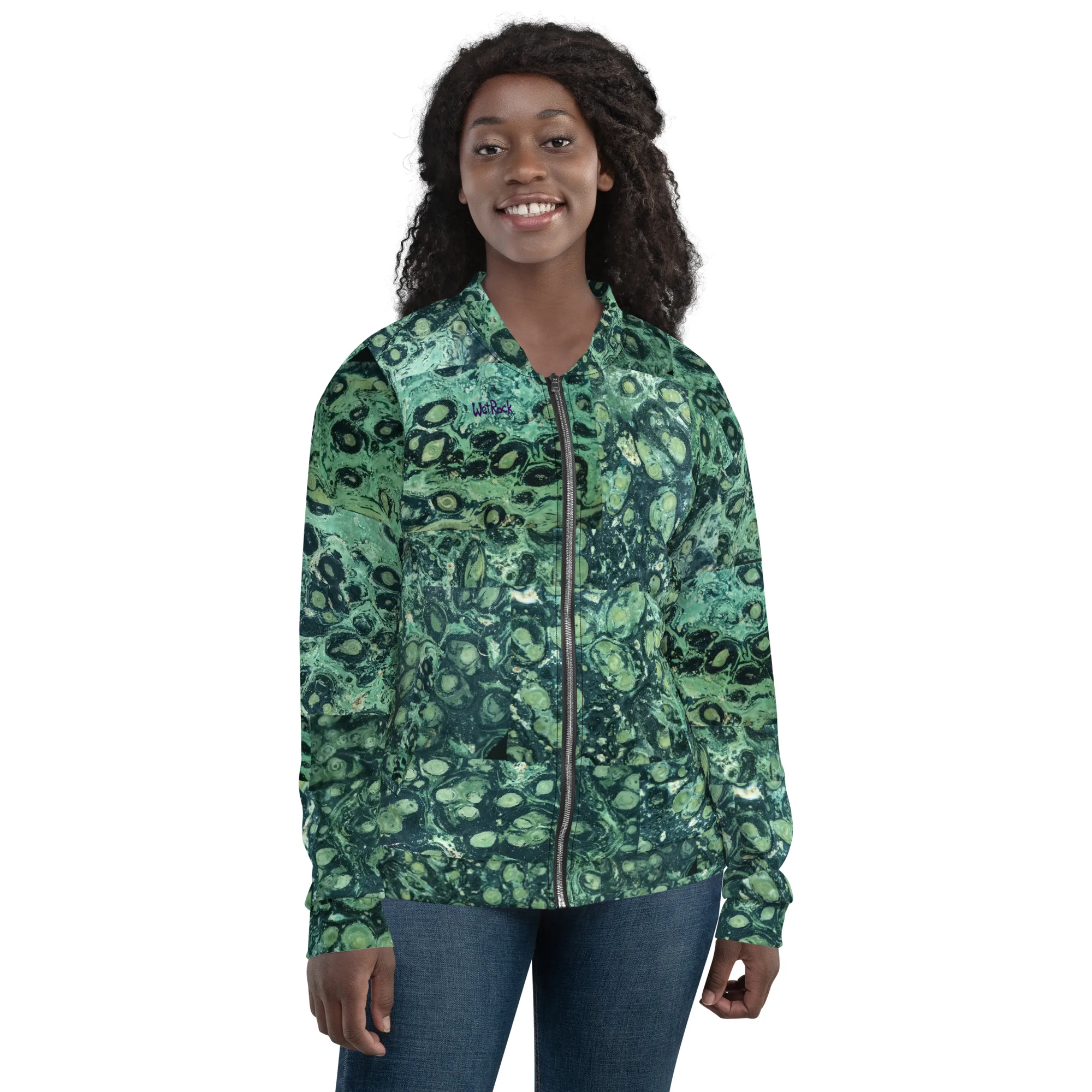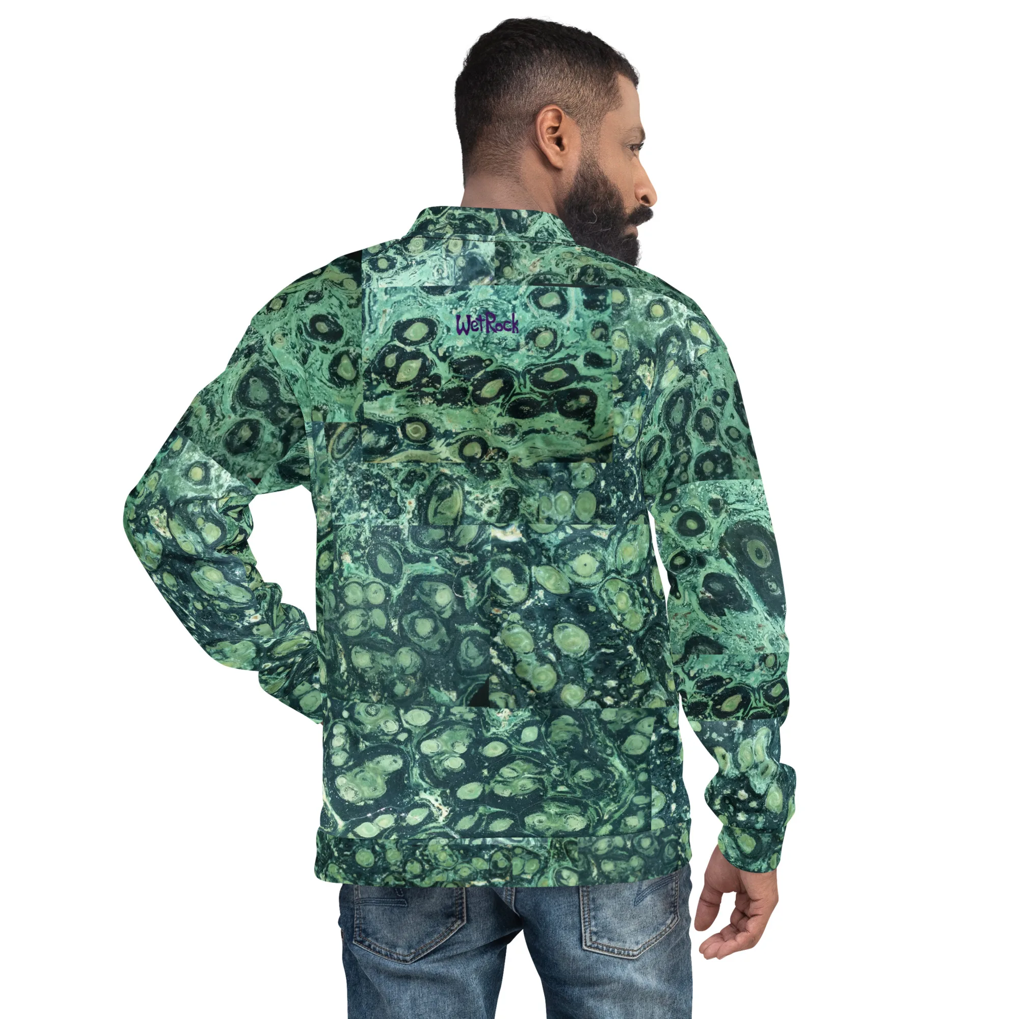 Rock your wardrobe with this unusual and colorful sliced-Kambaba-Jasper photo-print Bomber Jacket. Wear it on a basic t-shirt, or layer it on top of a warm hoodie—it’ll look great either way. With a brushed fleece inside, and a relaxed unisex fit, this Bomber Jacket is just the stuff of the dreams, so be quick to grab yourself one! Rock Photos taken at Wet Rock Gardens Flower Farm in Springfield, Oregon.