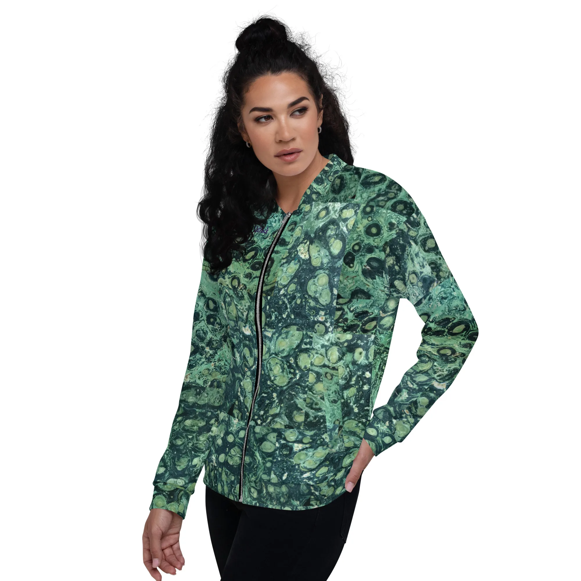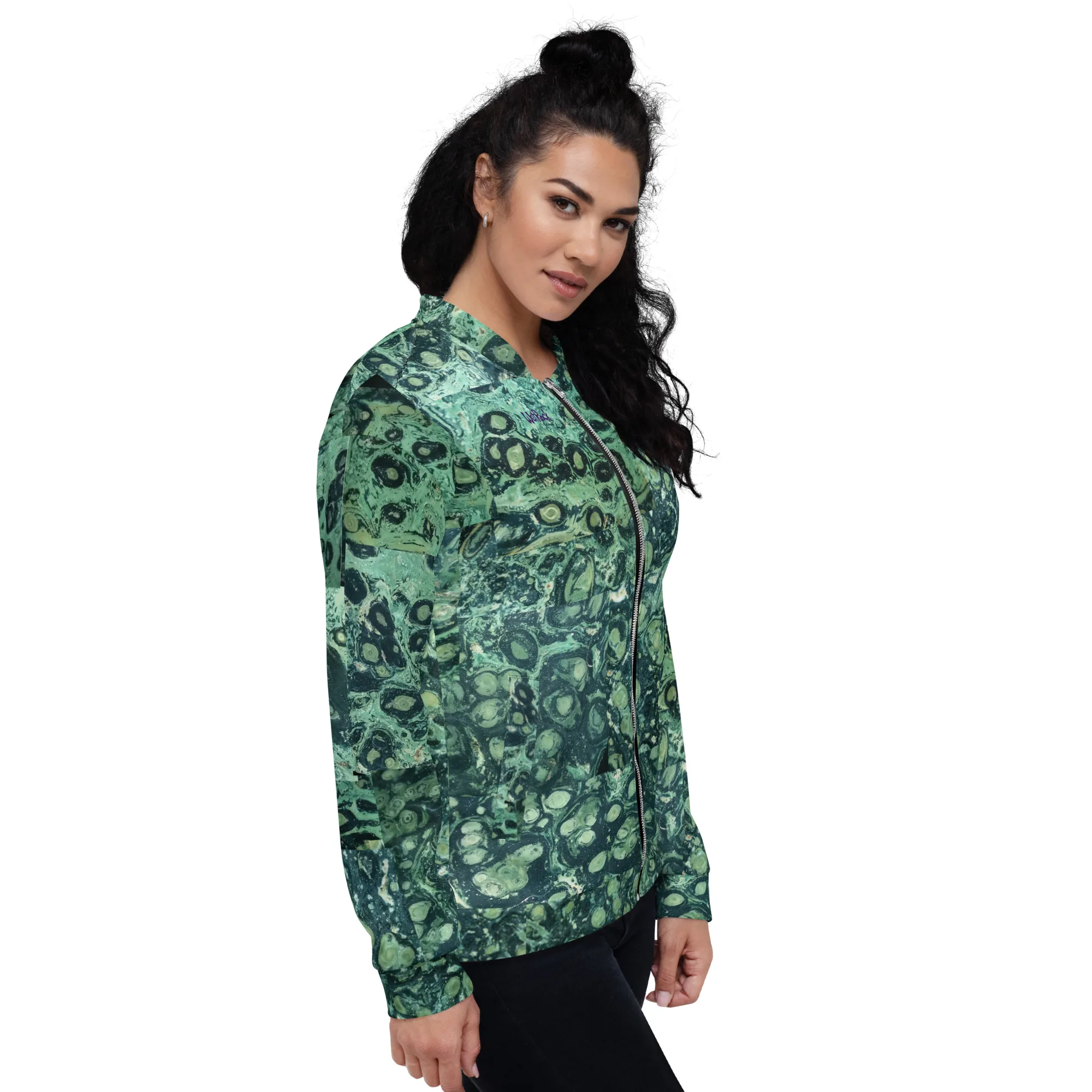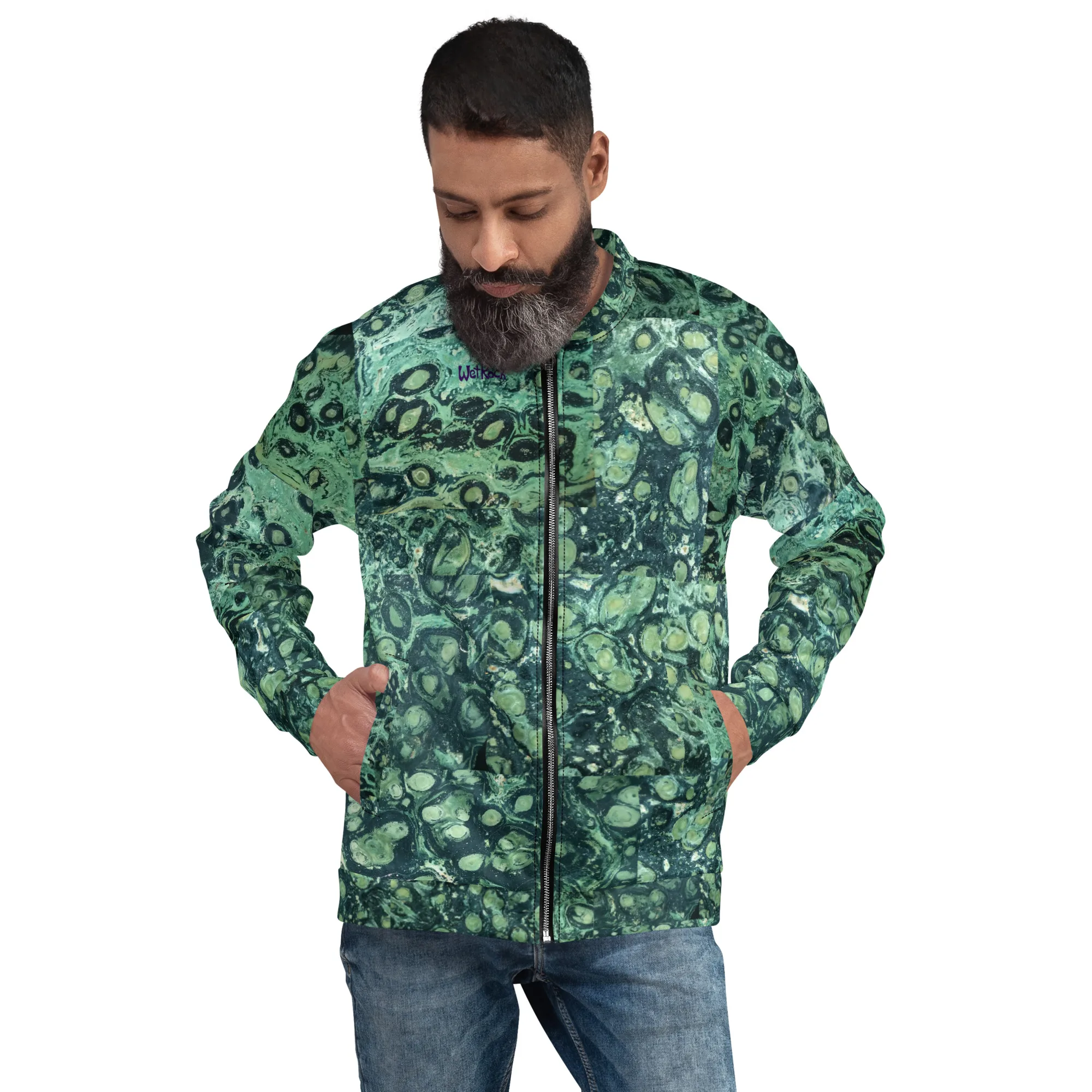 Rock your wardrobe with this unusual and colorful sliced-Kambaba-Jasper photo-print Bomber Jacket. Wear it on a basic t-shirt, or layer it on top of a warm hoodie—it’ll look great either way. With a brushed fleece inside, and a relaxed unisex fit, this Bomber Jacket is just the stuff of the dreams, so be quick to grab yourself one! Rock Photos taken at Wet Rock Gardens Flower Farm in Springfield, Oregon.