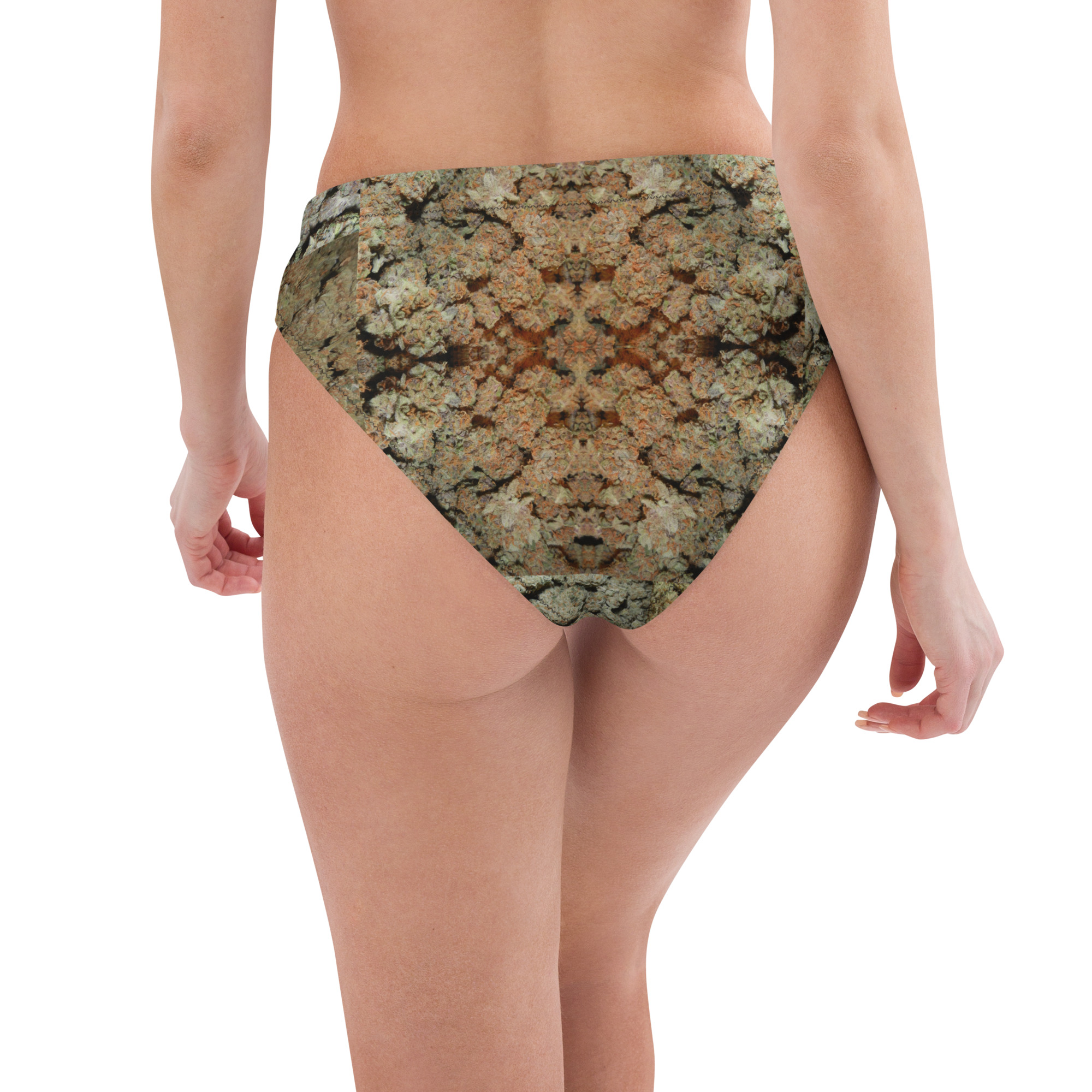 Get this Recycled high-waisted bikini swimsuit bottom covered in marijuana buds. Match it with your favorite top. It’s comfortable, high-waisted, and double-layered—perfect for an adventurous beach day or a chill spa visit! This swimwear Bottom is what we call a “Peachy” design. The related two-piece set we offer has “Peachy” on top and “Purple” on the bottom. We also offer a “Purple Buds” Top as a separate product in case you want to mix or match.