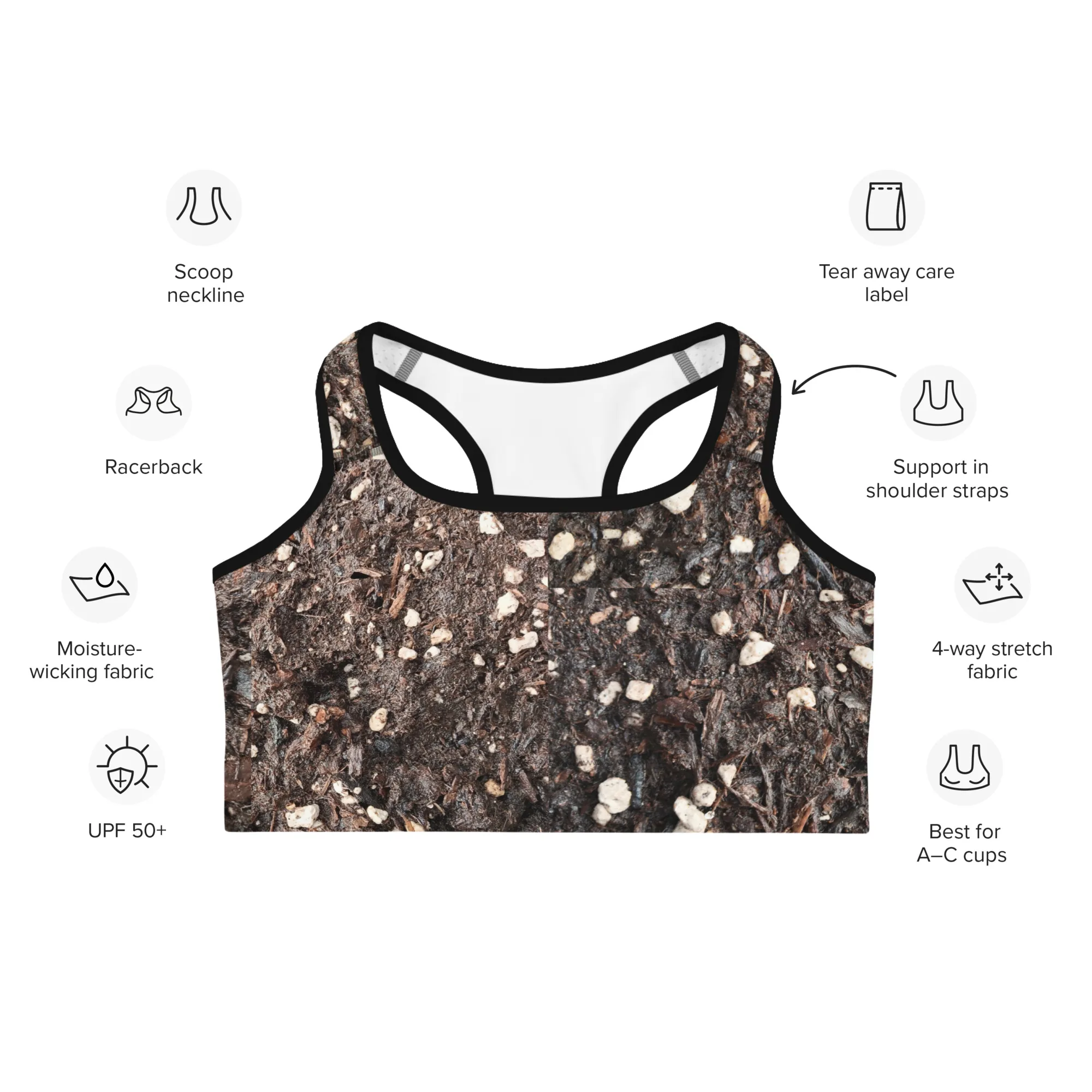This Unusual Brown Sports Bra is made from moisture-wicking material that stays dry during low and medium intensity workouts. The bra has support material in the shoulder straps, double layer front, and a wide elastic band to ensure constant support. We also have matching Leggings, a Yoga Matt and more. Photos taken at the Wet Rock Gardens flower farm’s Seed-Planting Greenhouse 🙂 Farm volunteers always appreciated!