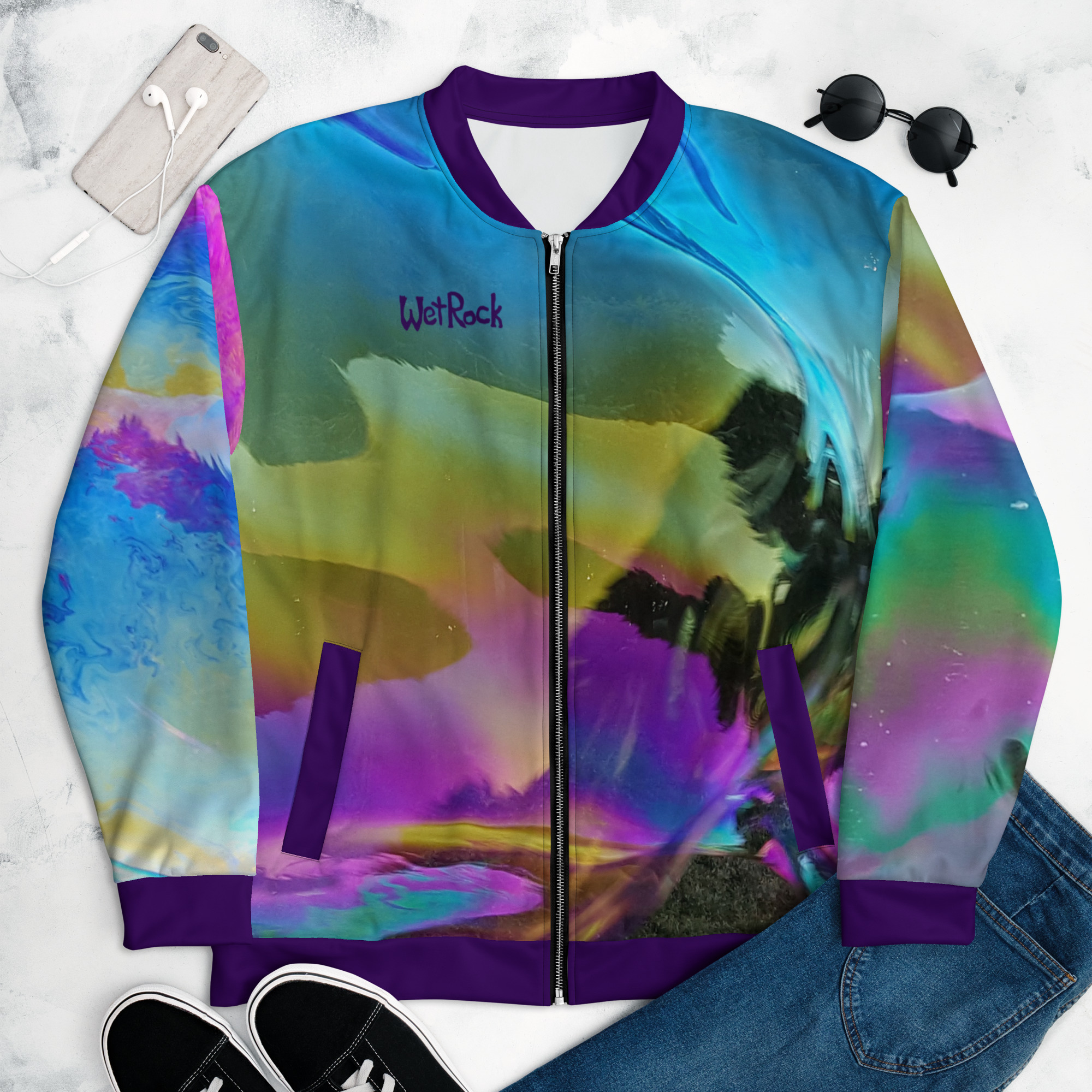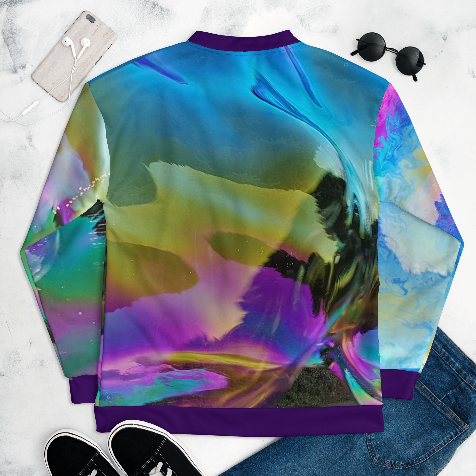 Add a little Soap-Bubble zing to your wardrobe with this vibrant All-Over Print “Bomber Jacket”. Wear it over a t-shirt, or layer it on top of a warm hoodie—it’ll look great either way. With a brushed fleece inside, and a relaxed unisex fit, this Bomber Jacket is just the stuff of the dreams, so be quick to grab yourself one! Pretty lightweight to be called a “jacket” in the US Northwest.