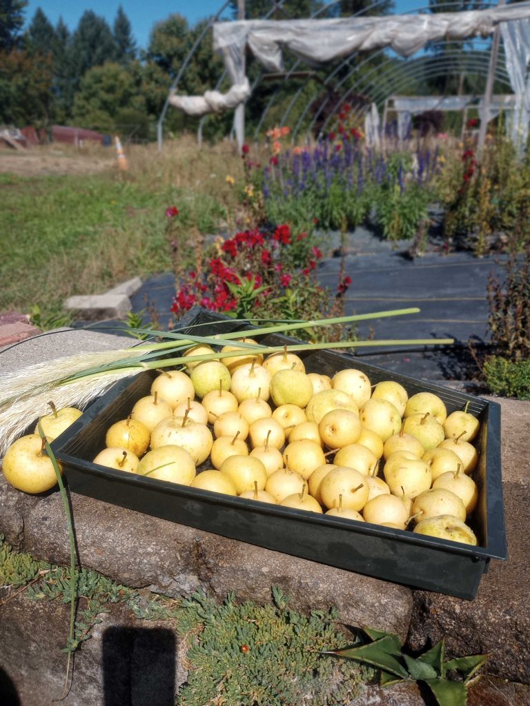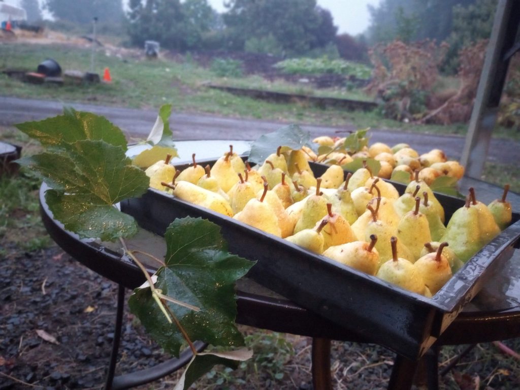 It’s gett’n Cold And Wet at the farm. We are still open after Halloween by appointment all winter. We have Apples, some small pumpkins, Some seedless grapes, Lots of Hazelnuts (aka Filberts) and a few Walnuts on the ground. There are probably a few flowers here and there. We will have a lot of “Greens”, Rosemary, Bay Leaves and miscellany for the creative designer all Winter. If you can, I’d wait for one of the many nice days to visit 🙂
